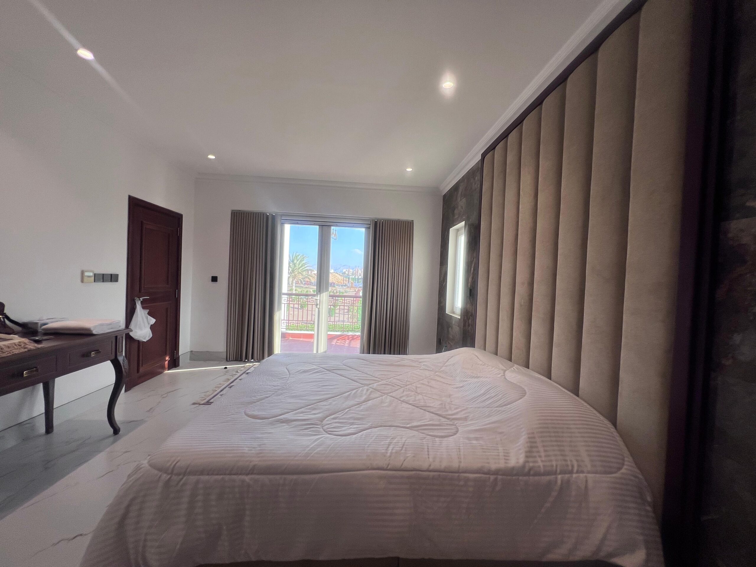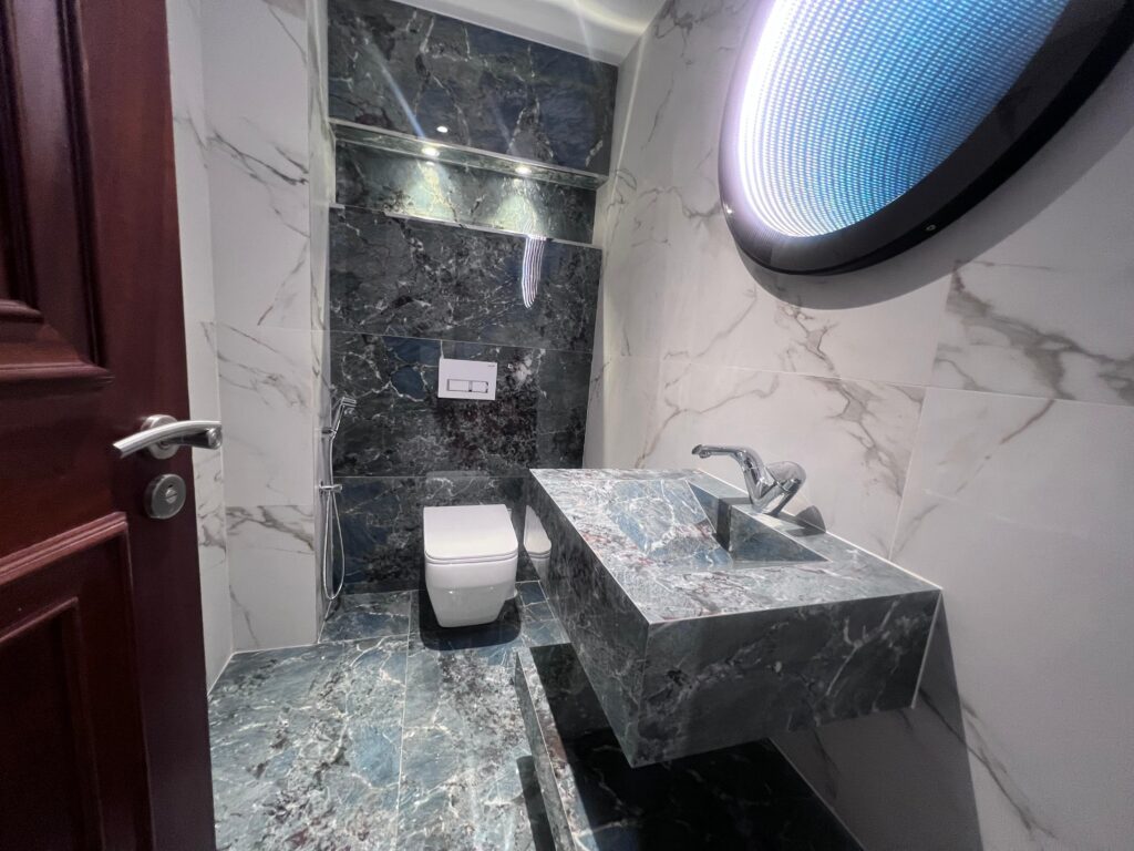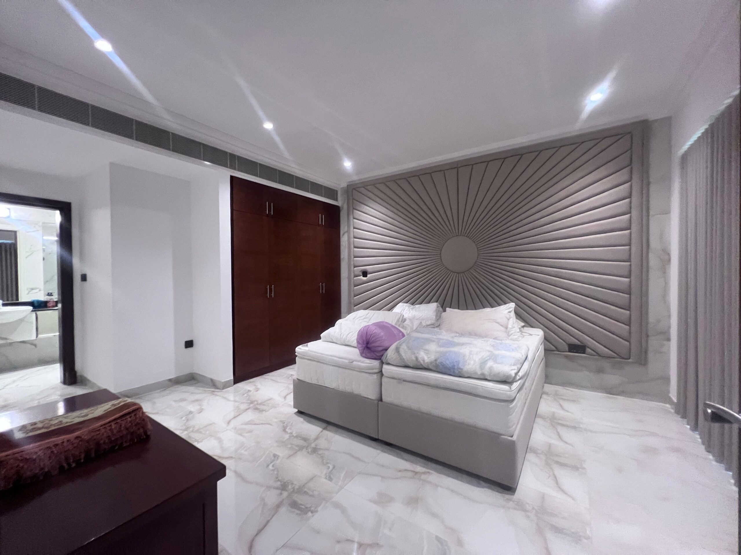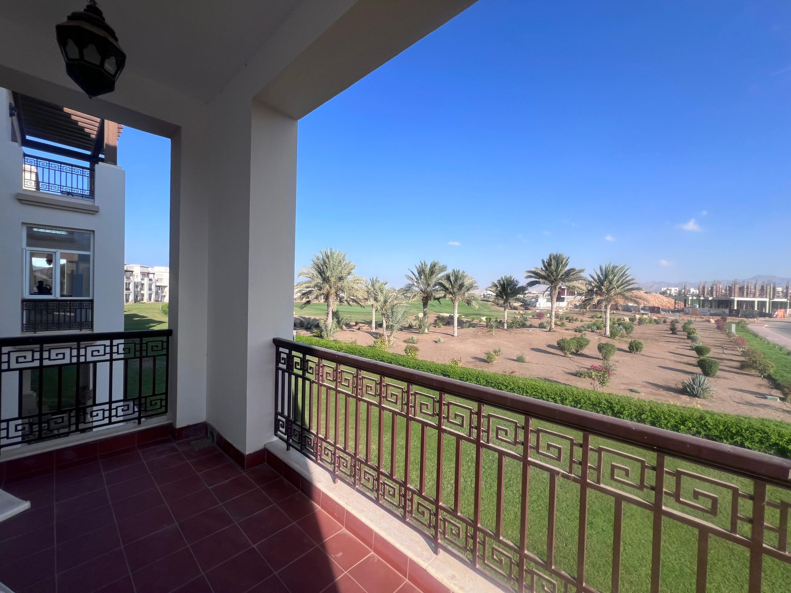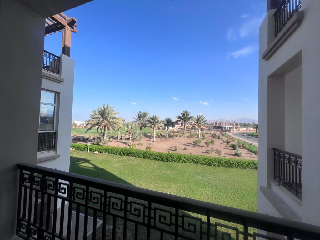 A stunning furnished apartment for rent in Muscat Hills, offering a premium lifestyle in a gated community with beautiful golf course views. The apartment features 2 bedrooms, 3 bathrooms, and three balconies.