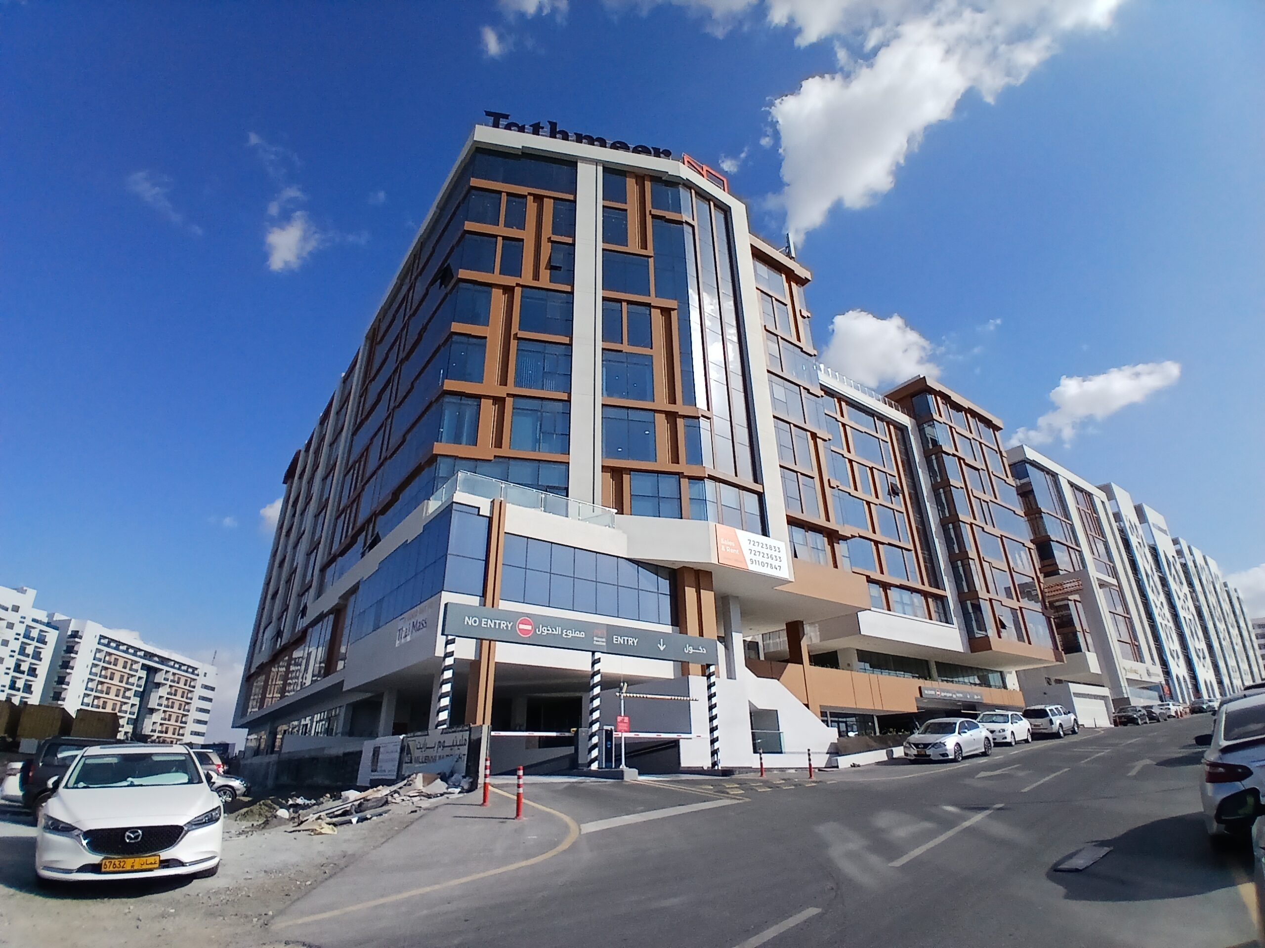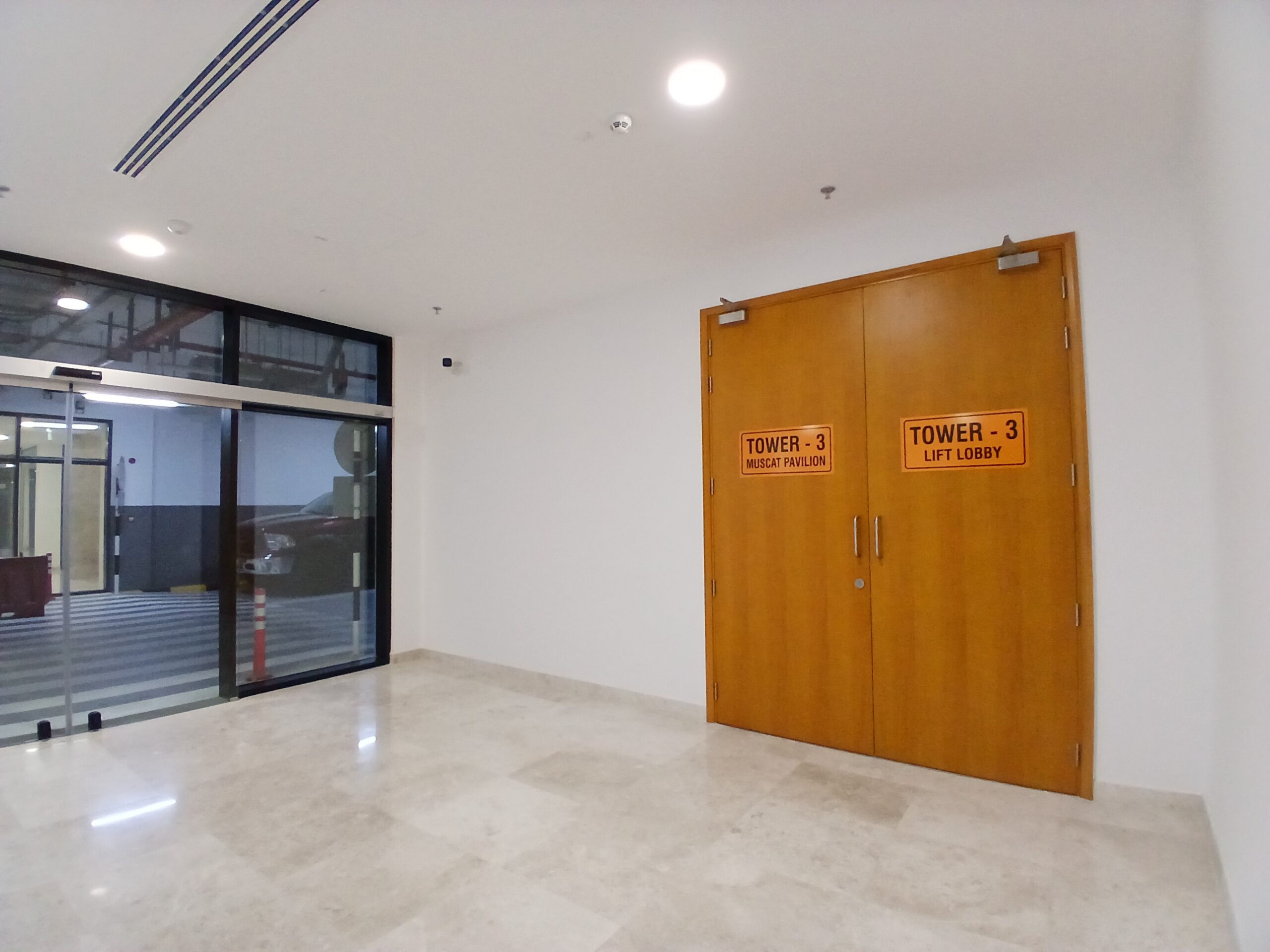 A prime office space for rent in Muscat Hills, located within the Muscat Pavilion complex, offering a professional and fully integrated working environment. The building features modern design, elevators, underground parking, and shared spaces.