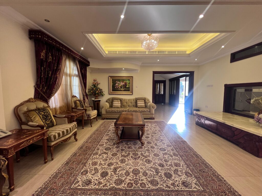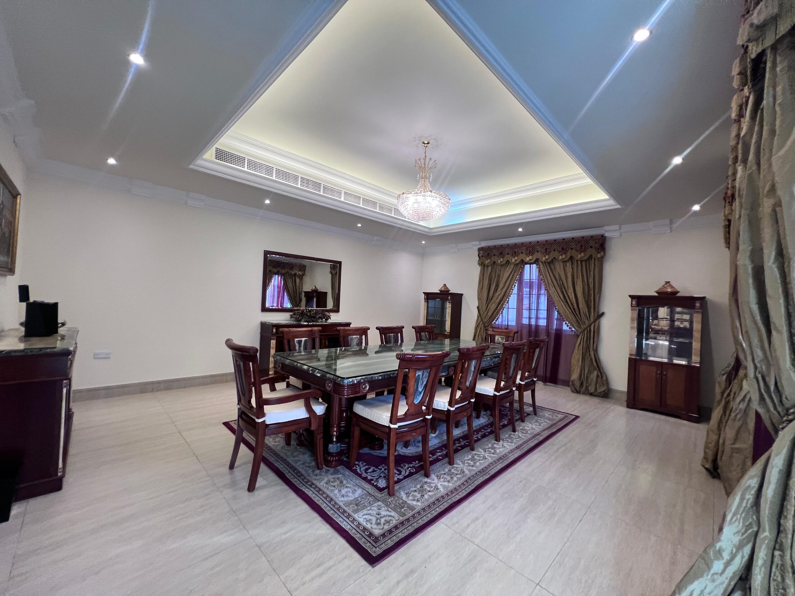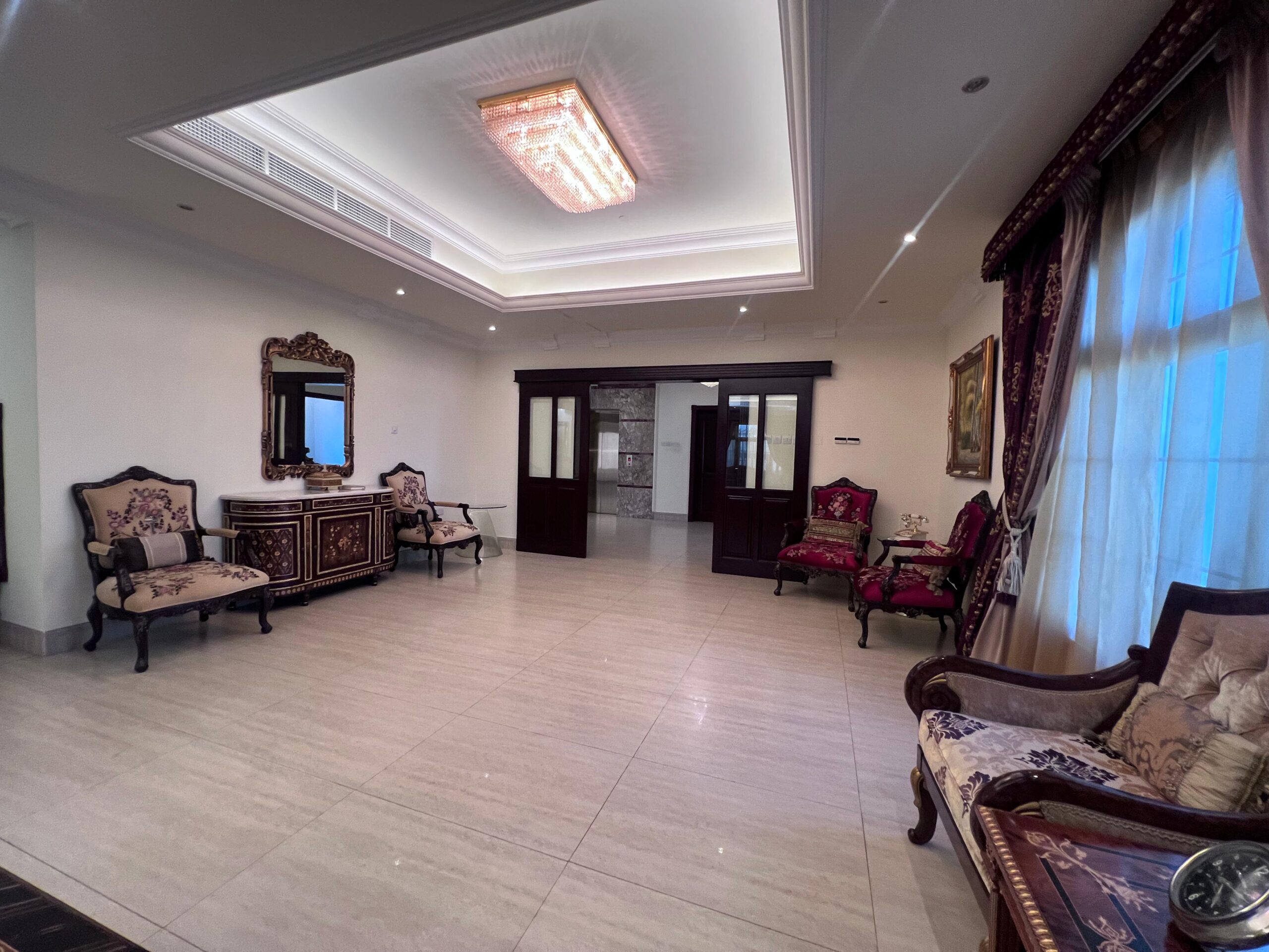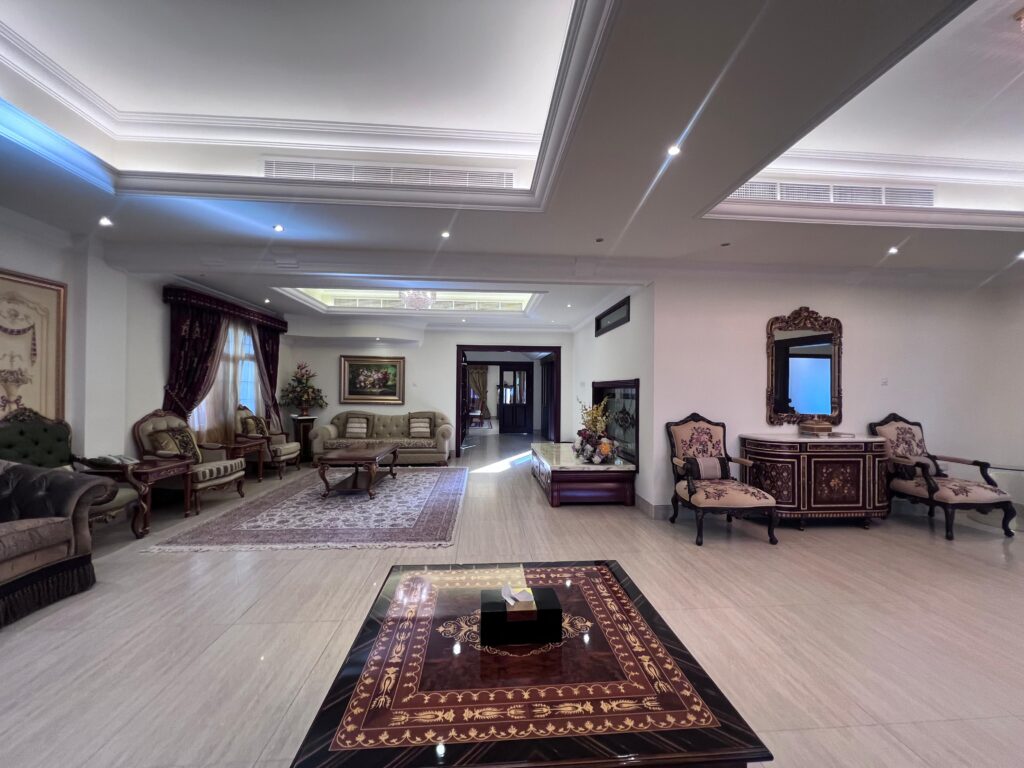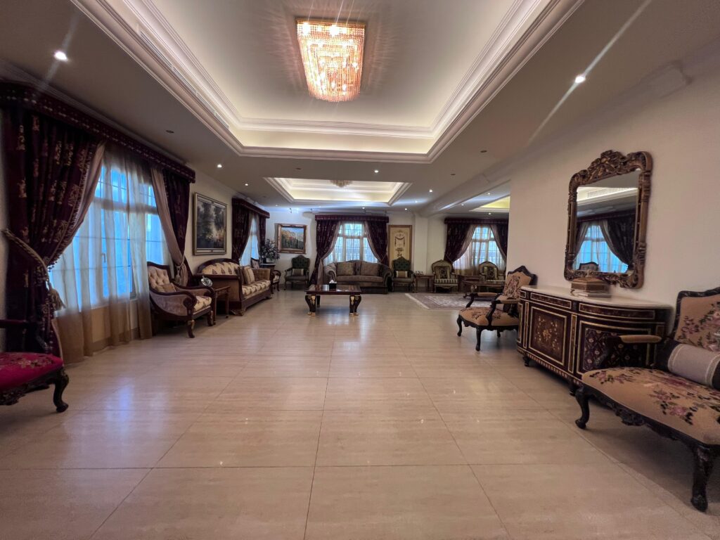 A fully furnished executive standalone villa for rent in Madinat Al Illam, offering an unmatched residential experience in terms of space, privacy, and luxury. The villa features 7+2 bedrooms, 9 bathrooms, four spacious halls, an office, three kitchens, and elegant indoor and outdoor living areas. The exterior includes a private swimming pool with washrooms, landscape gardens, pergolas with seating, and a BBQ area