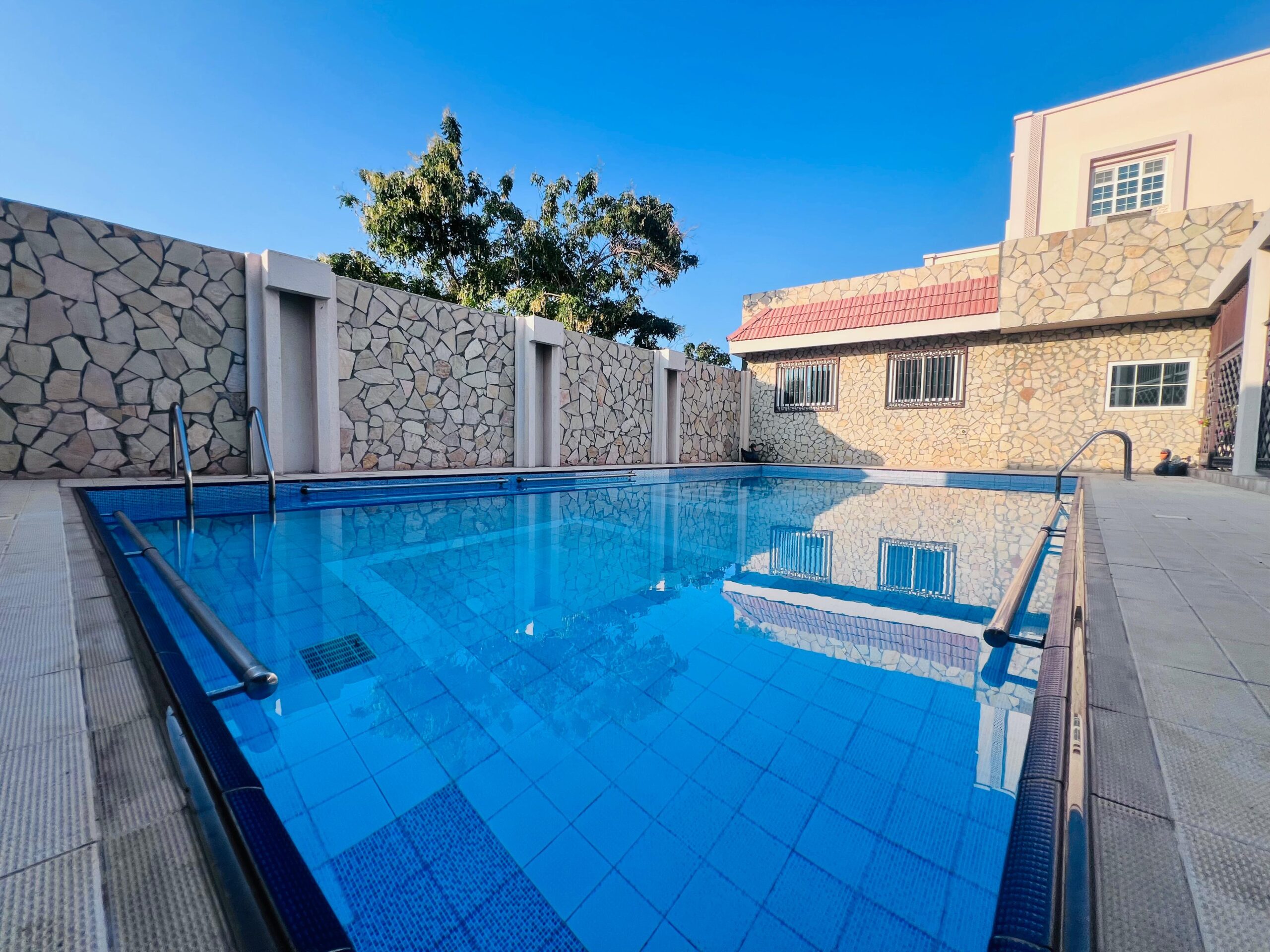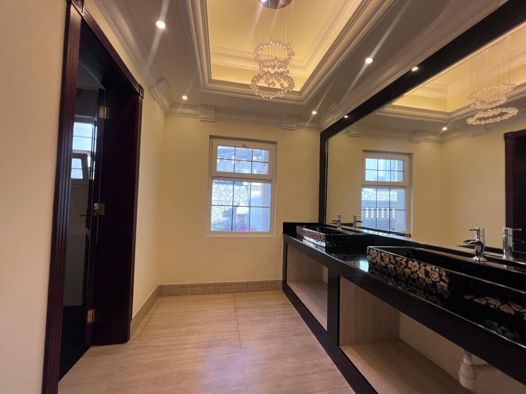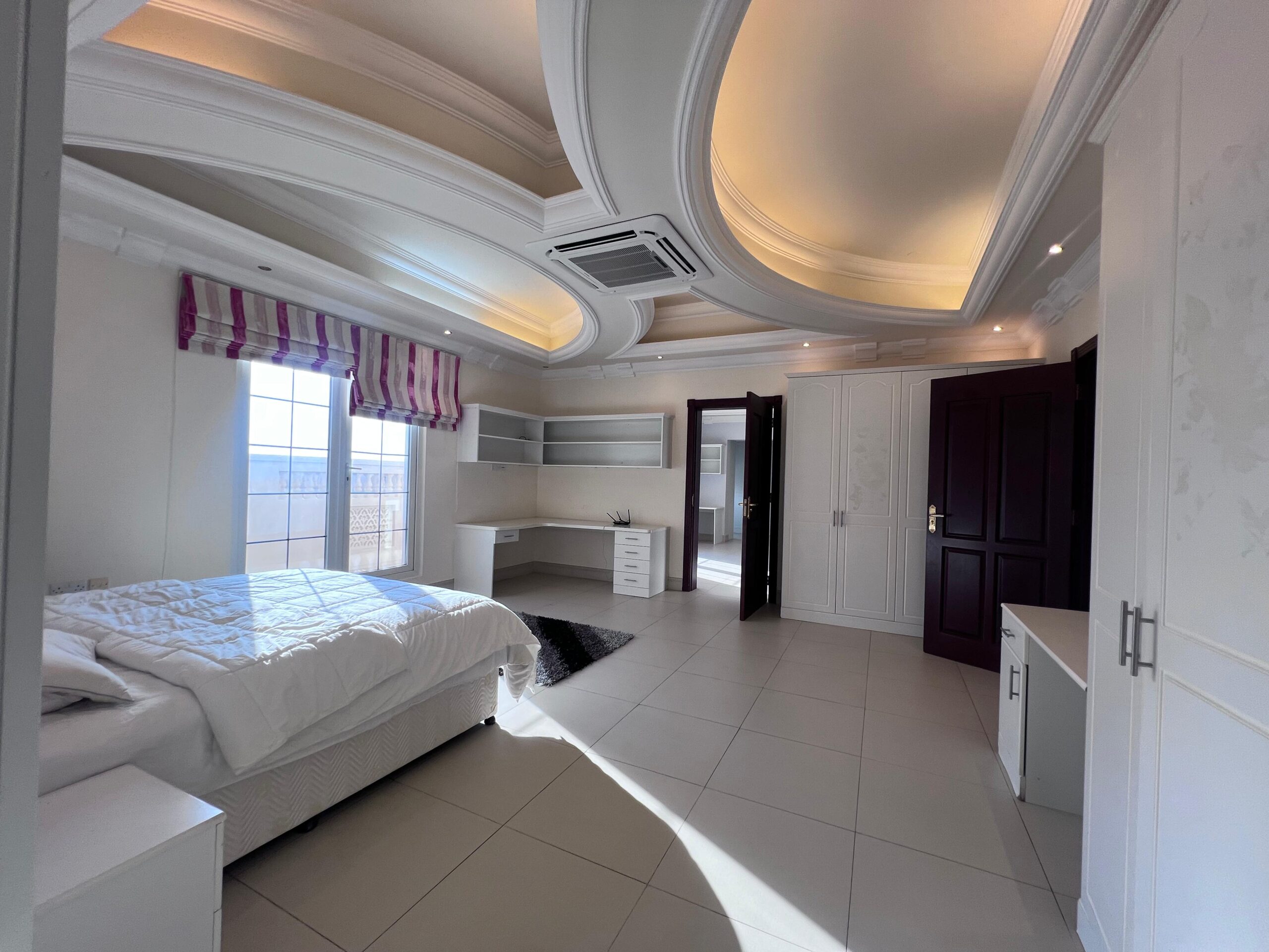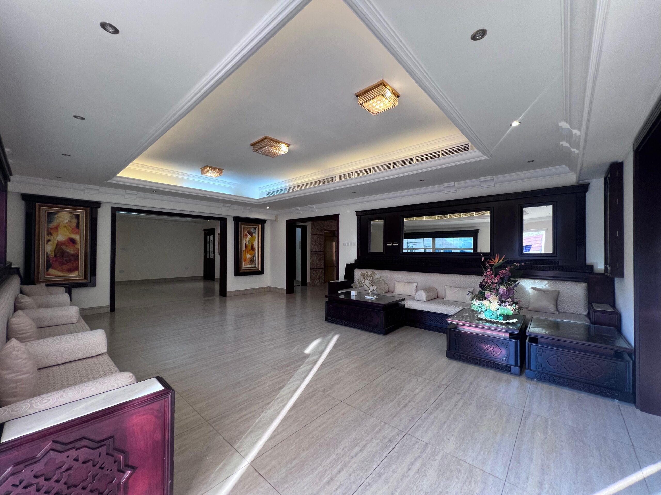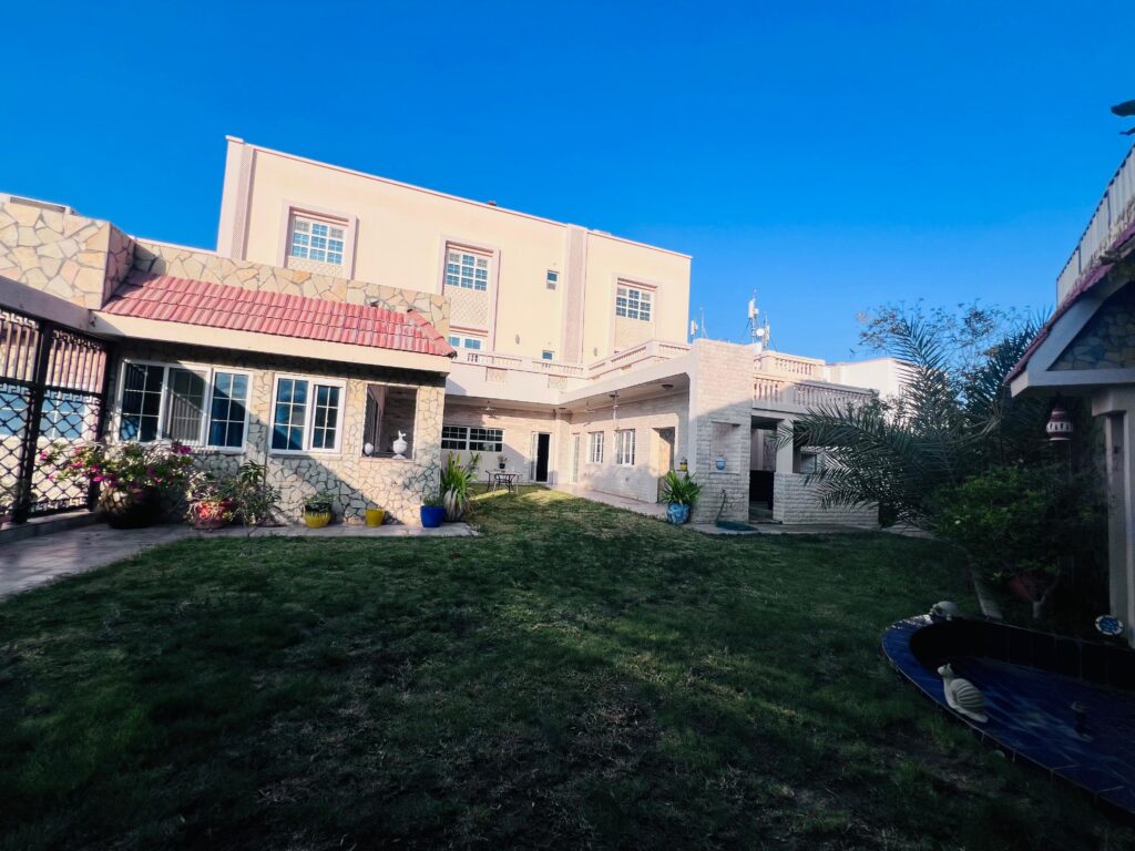 A fully furnished executive standalone villa for rent in Madinat Al Illam, offering an unmatched residential experience in terms of space, privacy, and luxury. The villa features 7+2 bedrooms, 9 bathrooms, four spacious halls, an office, three kitchens, and elegant indoor and outdoor living areas. The exterior includes a private swimming pool with washrooms, landscape gardens, pergolas with seating, and a BBQ area